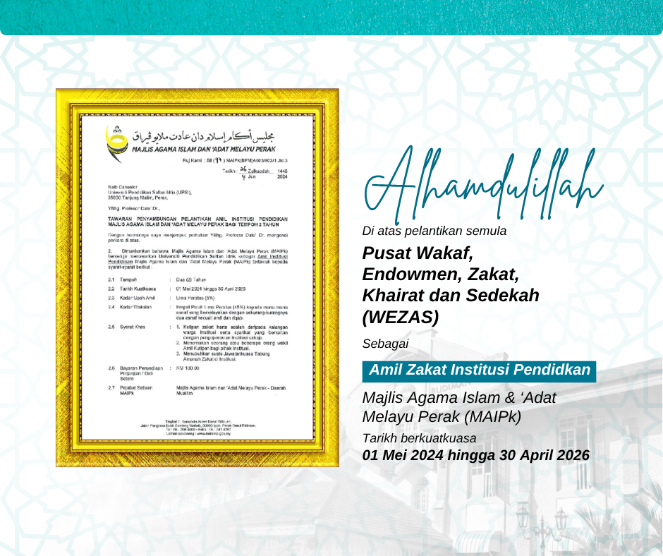 The Center for Waqf, Endowment, Zakat, Khairat, and Sadaqah (WEZAS) has been reappointed as an Institutional Zakat Amil by the Perak Islamic Religious and Malay Customs Council (MAIPk), effective from May 1, 2024, to April 30, 2026. This reappointment signifies MAIPk’s recognition of WEZAS’s capability, integrity, and commitment in managing the collection and distribution of zakat within educational institutions professionally and effectively.